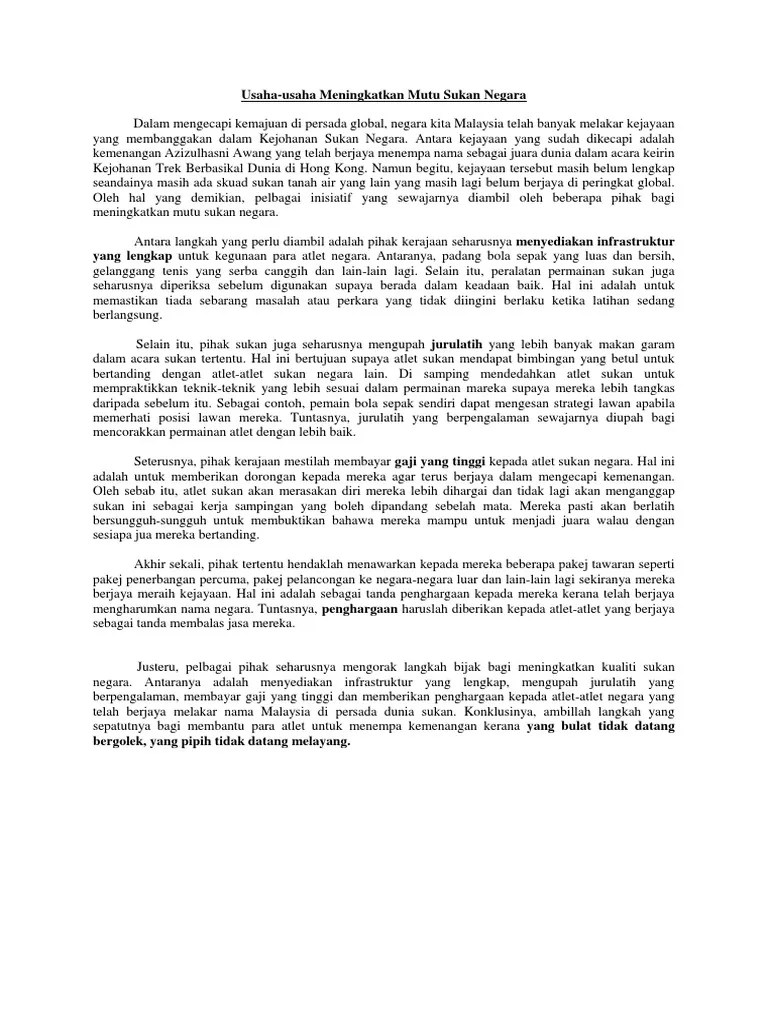 Langkah meningkatkan mutu sukan negara. You can also bookmark this page with the url . Apakah langkah konkrit dan menyeluruh boleh diambil untuk meningkatkan mutu sukan negara supaya kita boleh duduk sama rendah dan berdiri sama tinggi dengan . You have just read the article entitled langkah langkah meningkatkan mutu sukan negara. Cara cara untuk meningkatan mutu sukan negara kita . Langkah meningkatkan mutu sukan negara. Kemenangan azizulhasni awang sebagai juara dunia dalam acara keirin kejohanan trek . Cara ini pasti dapat meningkatkan mutu sukan negara.